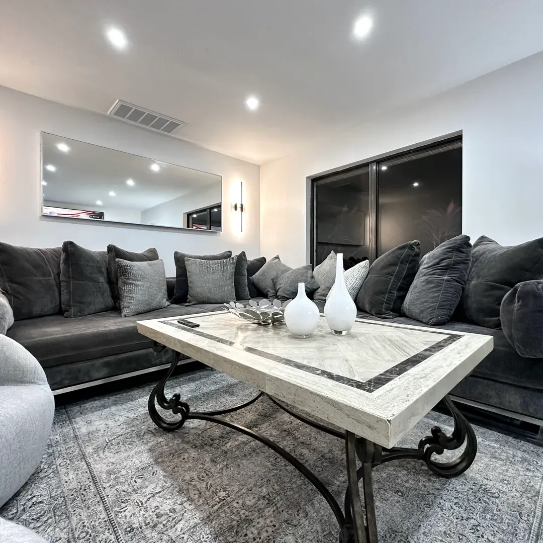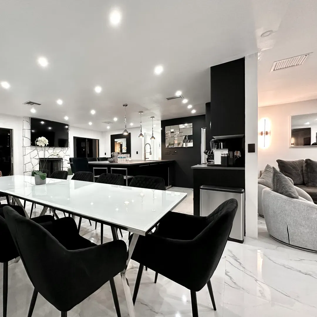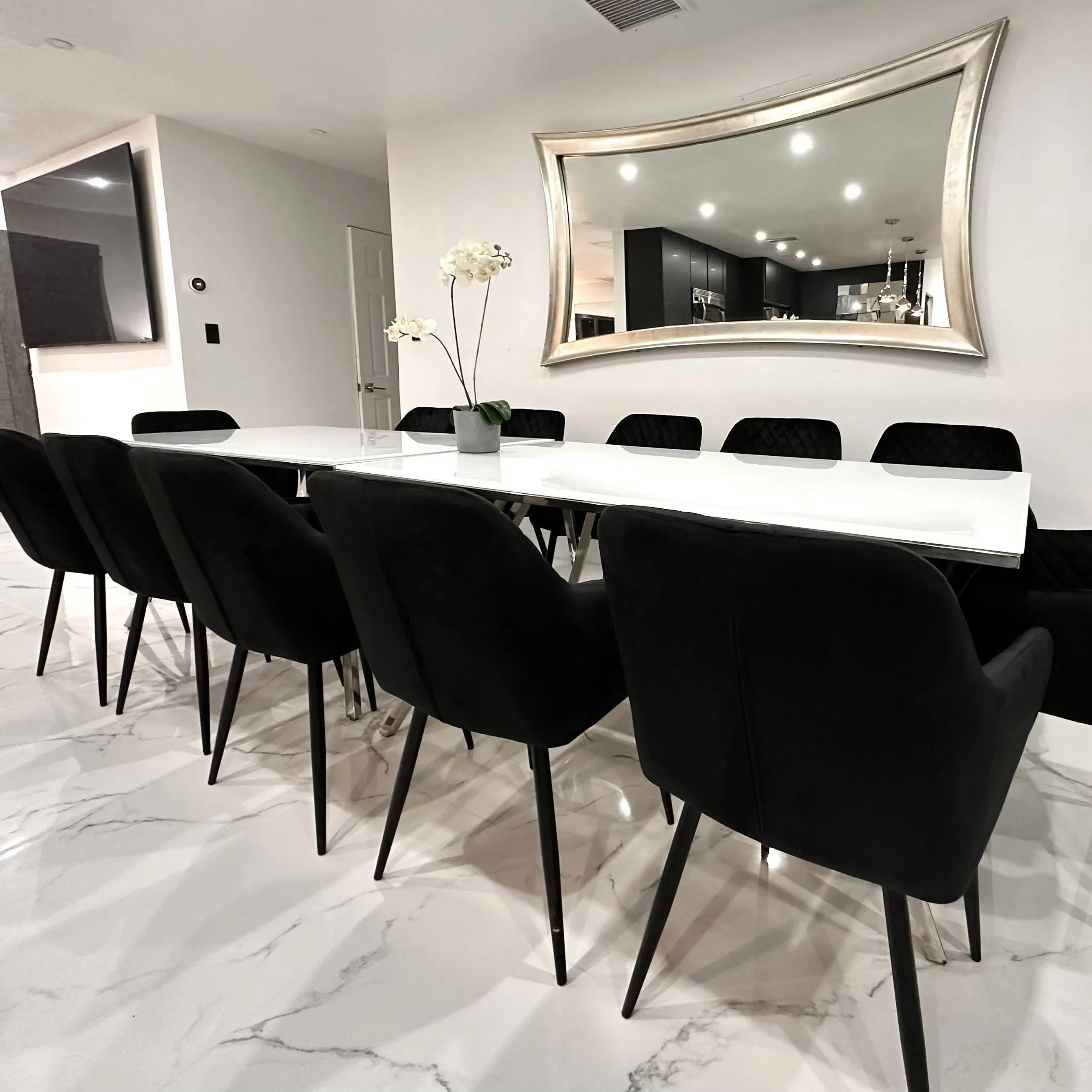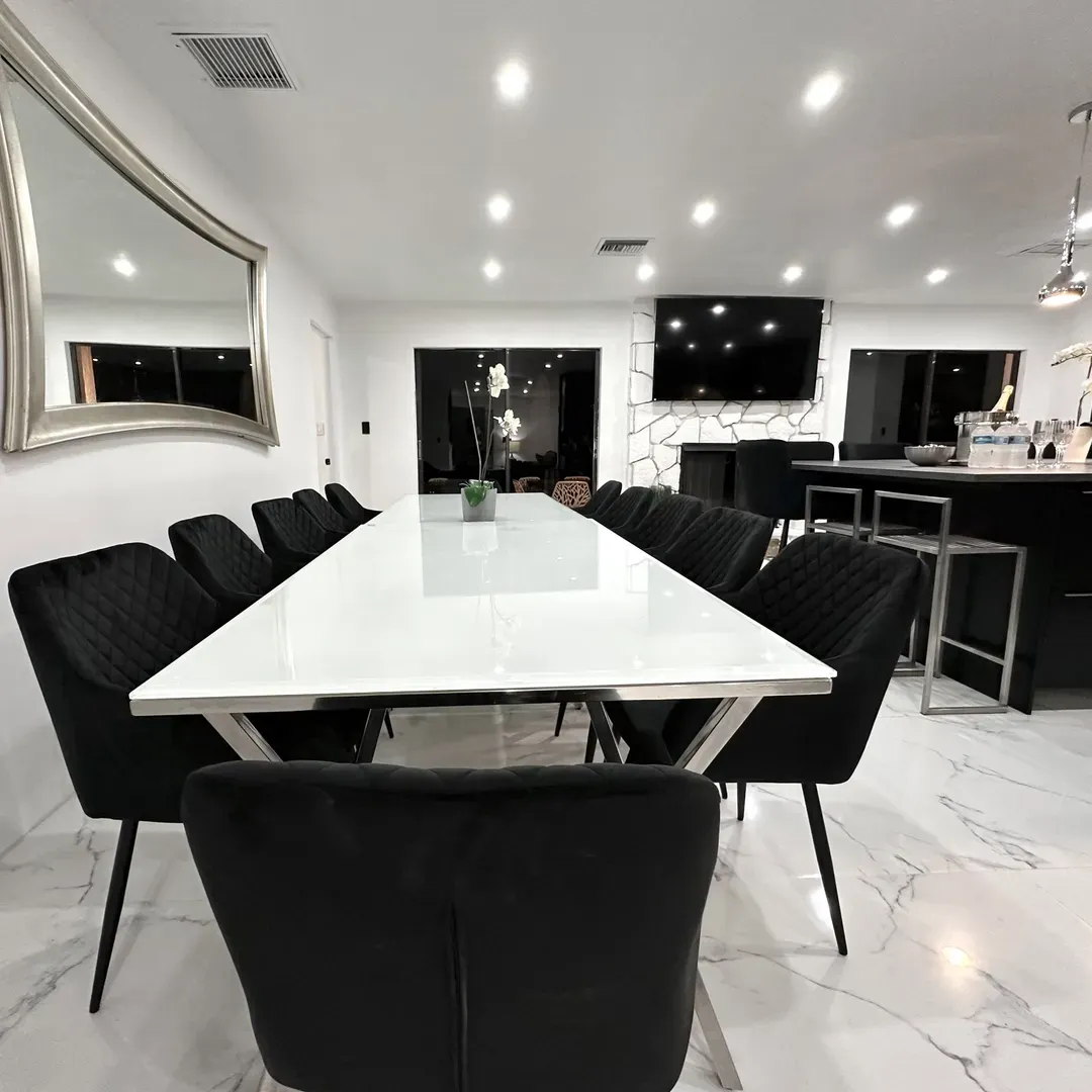 The dining table can seat up to 12 people, making it the perfect place for a family dinner or a fun game night. The living room features an oversized sofa group and a 75 inch plasma smart TV, perfect for movie nights or catching up on your favorite shows.